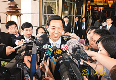 薄熙來在大會上發言剛結束即被記者「圍攻」採訪。 (新華社)