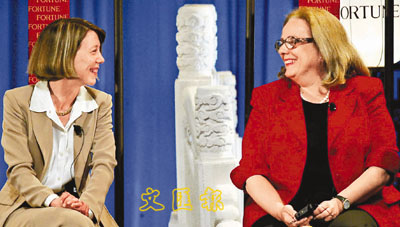 聯想國際公司首席運營官弗蘭克斯.蘇立文(左)、Linktone公司董事長艾琳.洛舍(右)作客《財富》論壇。 (新華社)
