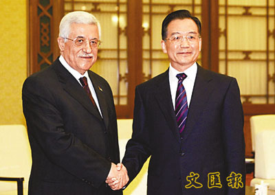 18日,國務院總理溫家寶在北京人民大會堂會見來訪的巴勒斯坦民族權力機構主席馬哈茂德.阿巴斯。(中新社)