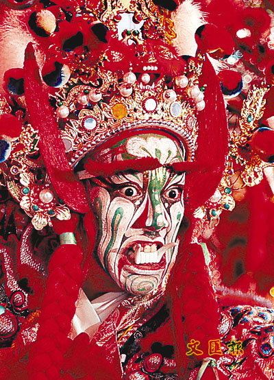 一名穿上民間服飾的藝人在台北保安宮前為一項文化活動扮演傳統人物「八將軍」。 (美聯社)