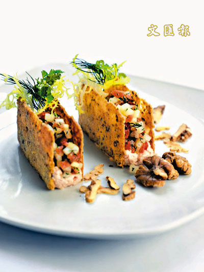 先把煙三文魚及青瓜切粒,加上具口感的合桃,份量不太多,賣相吸引特別惹味,醒神開胃。$40