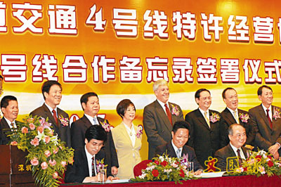 香港地鐵公司昨日在深圳與當地政府簽署地鐵四號線特許經營協議及二、三號線合作備忘錄。深圳市委副書記、常務副市長許宗衡及香港特區環境運輸及工務局局長廖秀冬等出席簽署儀式。 (中新社)