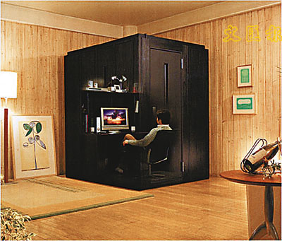 這個名為「My Room」的透明小型隔音室(見圖),面積2.5平方米,共有3種顏色可供選擇,每個售價約3000美元(約2.3萬港元),用家可將它放在一個普通大小客廳的一角。隔音室雖然狹窄,但「麻雀雖小,五臟俱全」,它可當作溫習室、電影院及花園小房等多種用途,用家可根據不同需要作出選擇,在裡面放置一張檯、一套環迴立體聲音響組合,也可放一張低的工作檯,專為呆板工作的人或書法家所用,用家還可選擇日本傳統的榻榻米裝設的設計。一名消費者表示,他利用My Room作視聽室,當他放工回家後,可在隔音室內觀看DVD及聽音樂,並可隨意調校自己喜歡的音量。預料My Room在日本有很大的市場潛力,因為日本絕大部分家庭都沒有額外房間來闢作書房,而售價也相宜,適合一般工薪家庭所負擔。(英國《泰晤士報》)