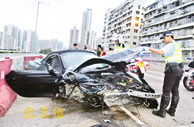 【本報訊】一輛價值近百萬的保時捷開篷跑車,昨晨在西九龍走廊以高速飛馳時,失控狂撼向路邊石壆,繼而狂打白鴿轉,將一列水馬撞至移位及漏水,跑車半邊車頭削去,零件飛墜天橋下,司機幸無受傷,事後棄車離去,並通知其父親到場善後。警方目前正在調查,意外中是否有人酒後駕駛。