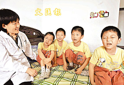 ■瀋陽一名醫生在5月30日的「國際兒童節」活動中,為4名「六胞胎」的生存兒童進行例行檢查。 法新社
