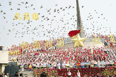 ■5月31日,潔白的和平鴿帶著中國少年兒童對祖國的祝福從北京世紀壇騰空而起。兩千多名出席第五次全國少年先鋒隊代表大會的代表及北京的少年兒童在星星火炬下,放飛希望祝福祖國。 (中新社)