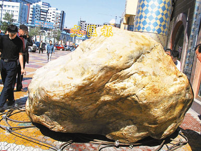 據該石主人艾買爾江介紹,此石是他2004年8月從新疆和田的克里雅河中發現的,當時該巨石僅露出一個小角,後經過22天的努力終將該巨石從河床裡調出。此石在和田初步鑒定是和田玉4級脂料。