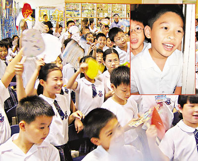 ■174間中小學昨參與「無冷氣日」,圖為善導小學學生齊以廢物再造紙扇搧走暑氣。小圖為小三生徐子熙笑言:「無冷氣好熱,但頂得順。」。 任智鵬 攝