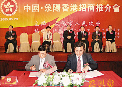 【本報訊】(記者 沈清麗)河南省滎陽市首次在香港舉辦招商活動,並與多間機構簽定了6項投資合作建設項目,投資金額達11.3億元人民幣(下同)。合作項目包括城市供熱、電子產品生產以及旅遊項目開發等。