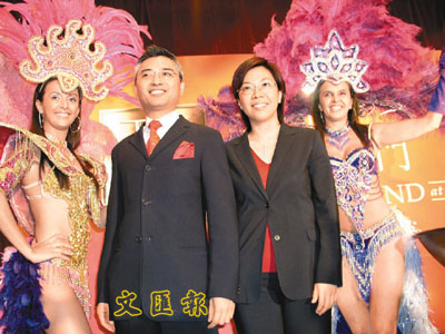 長實黃思聰(左二)與梁婉君招來森巴女郎為「名門」造勢。周穎 攝