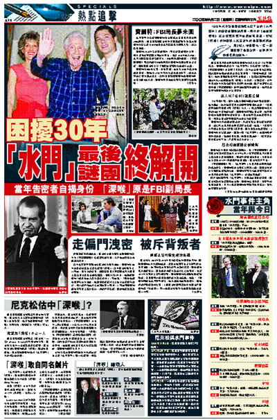 1970年代引致美國總統尼克松下台的「水門事件」的最後疑團終於解開,爆料的《華盛頓郵報》記者伍德沃德和伯恩斯坦承認,綽號「深喉」的神秘線人就是當年的美國聯邦調查局2號人物費爾特。這一謎團困擾了美國政界、史學界和普通民眾30餘年。