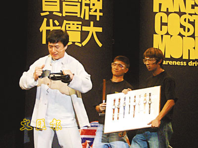 【本報訊】(記者 李慶全)成龍昨日應邀出席「買假貨、代價大」的記者招待會,席上成龍並與「假貨國際專家」孟方睿即場演繹一幕短劇,成龍先乘電單車出場,並擊退多個「翻版成龍」。他還手持電鋸,將放滿假貨的攤檔清拆走,又將孟方睿身上的假名牌西裝及皮鞋撕爛。
