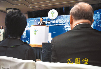 ■曾蔭權在台上發言,其夫人(左)與李國寶(右)在台下全神貫注,默默支持。葉傲冬 攝