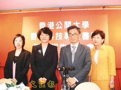 ■科技專上書院代表曾潔萍女士及時美真校長(左一及左二)與公開大學代表許韻玲女士及黃錫楠副校長(右一及右二)宣佈兩所院校將於今年聯合招生。 葉寶群 攝