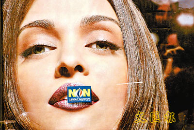 法國極右戰線支持者在海報美女唇上貼上「不」的貼紙,號召民眾在歐盟憲法的全民公決中投反對票。(法新社)
