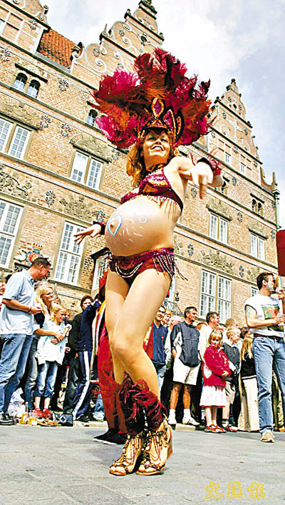 北歐最大的亞爾堡巡遊,參觀者達二萬五千人,連懷胎八月的女郎也來湊熱鬧,勁舞助慶。(法新社)