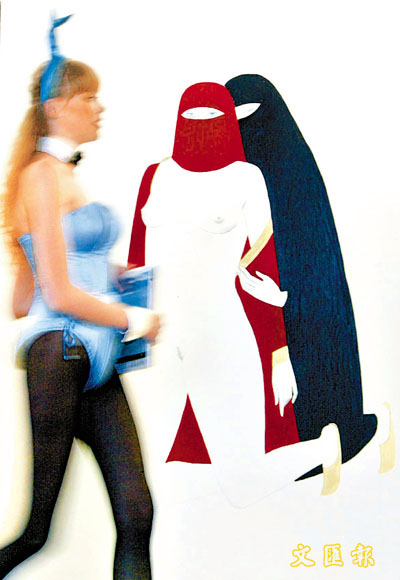 「Art Moscow」以現代藝術為核心,參加者來自歐亞,以及美國,如圖中在裸女油畫前的兔女郎。(法新社)