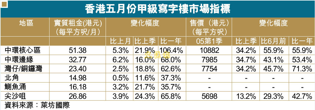 [2005-06-07] 香港五月份甲級寫字樓市場指標