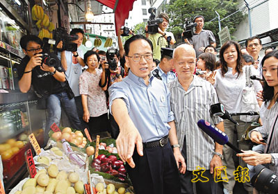 參觀警察宿舍後,曾蔭權往附近老街坊李伯的生果店選購水果。 劉國權 攝