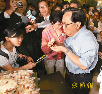 「好味!」曾蔭權到國金一期商場其中一間餅店內買餅及試食,並大讚好吃。 張立新 攝