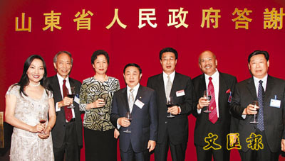■在答謝晚宴上,(左起)蔣麗莉、呂明華、郭莉、山東省省長韓寓群、副省長孫守璞、黃熾雄、王春濤等互相祝酒 ,場面熱鬧。 趙焜崗 攝