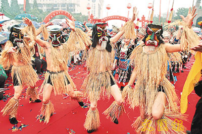 12日,南昌10萬市民冒雨上街觀看35支中外儺舞表演隊巡街表演。儺舞在中國有3,000多年歷史。 中新社