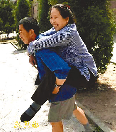 ■賈文龍背著喻曉梅,一背就是20年。網上圖片