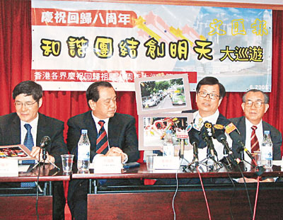 【本報訊】工聯會、新界鄉議局及中華總商會等19個團體,將於7月1日舉行慶祝回歸8周年「和諧團結創明天大巡遊」,預計約2萬人參加。籌委會發言人兼工聯會會長鄭耀棠表示,在回歸日發起巡遊,並非針對於同日舉行的七一遊行,而是要凝聚各界力量及創建和諧氣氛,並讓市民表達慶祝回歸的心情。