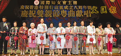 【本報訊】(記者 鄭群)國際婦女會昨假紅磡高山劇場舉行慶祝香港特別行政區成立8周年暨慶祝雙親節粵曲獻唱大會,賓主逾千人歡聚一堂共賀佳節,該會主席徐余梅馨希望藉慶祝母親節及父親節的活動,頌揚親恩的偉大,提醒做子女的不忘父母恩,弘揚中國傳統孝義,共同締造和諧社會。而今年適逢香港回歸祖國8周年,她祝願「一國兩制」的香港明天更美好!