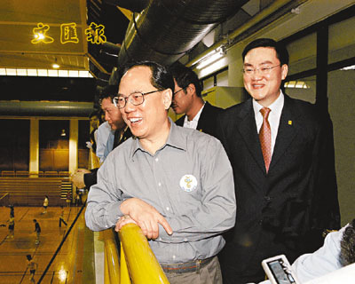 ■曾蔭權在仁愛堂主席龐維新陪同下參觀室內球場。