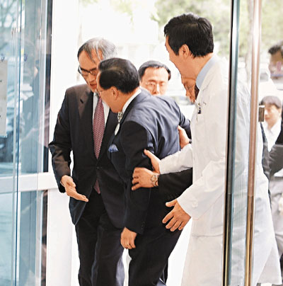 馬失前蹄,曾蔭權一度險些摔倒,幸劉遵義(左)與沈祖堯(右)眼明手快,立即伸手攙扶。 劉國權 攝
