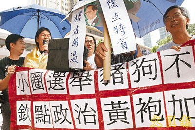 長毛梁國雄到選舉事務處向煲呔贈興,拉開標語示威。趙焜崗 攝