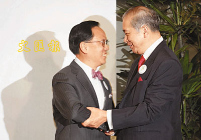 曾蔭權與李國寶握手共賀競選成功。 潘達文 攝