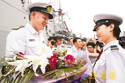 17日,新西蘭海軍「特瑪那」號護衛艦和「奮進」號補給油船組成的艦艇編隊,駛抵上海海軍揚子江碼頭。中國海軍女兵向到訪的新西蘭國防軍聯合司令部海上部隊司令斯蒂爾準將獻花。 新華社
