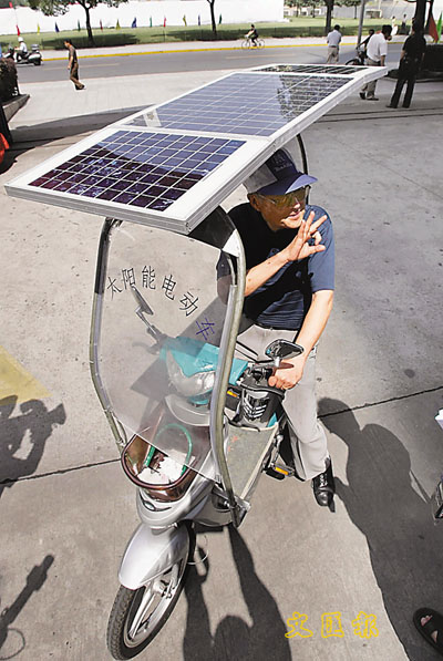 日前,在杭州舉辦的節能產品與成果展上,74歲的徐志清老人,將自己製作的一輛利用太陽能為蓄電池充電的電動自行車,騎到了現場。 新華社