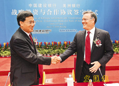 全美第二大的美國銀行,昨與建行簽署合作協議,以30億美元作價(約234億港元)入股建行9%。當中包括以25億美元向中央匯金投資購入所持的建行舊股,餘下5億美元則留作建行首次公開招股時認購股份。外電指是次入股作價約相當於建行帳面價值的1.1至1.2倍。美銀將委派一員進入建行董事會,在新成立的16至19人董事會中佔有一個席位。荷蘭銀行分析員Simon Ho認為,大部分外資銀行均希望染指內地的零售銀行業務,美銀入股建行的作價不算昂貴。