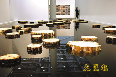 瑞士巴塞爾國際藝術博覽會「Art 36」上,德國藝術家的裝置藝術「S.R.」映照出展覽中心的天花,只是那些木樁看起來有點礙眼,像一個個痂。 (美聯社)