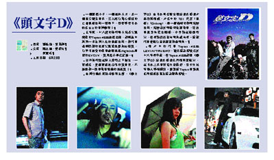 由周杰倫及陳冠希領銜主演,《頭文字D》由日本同名殿堂級漫畫及動畫片集改編而成,片名中的「D」代表「飄移」(Drifting),是一種獨特的拐彎駕駛技術。駕駛者於彎路時急速煞車,導致車尾呈失控性擺動,令四輪在路面滑行,但前輪仍然指向彎角或向前。這樣汽車便能以最快速度拐過彎角。