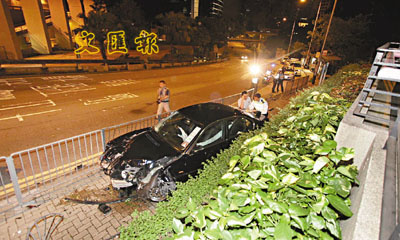 【本報訊】一名姓張(40歲)男子駕駛一輛名貴房車駛經中環紅棉道時,在「霆鋒彎」失控掃欄後剷上行人路(見圖),僅受輕傷拒絕送院,惟被驗出酒精超標,懷疑醉酒駕駛被捕。
