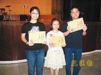 徵文比賽得獎者冠軍,左起初中組陳愷芸、小學組方琪蔚及公開組陳志輝。陳玉鳳 攝