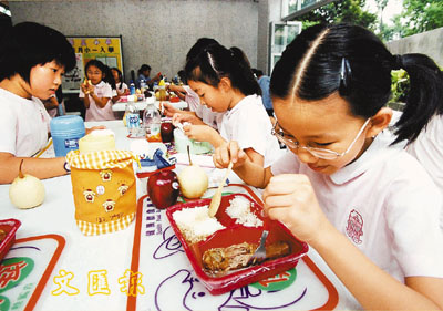 ■小學生中午在學校吃飯多用即棄飯盒。 資料圖片