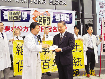 ■郭家麒把校友反對冠名的聲明交予副校長李焯芬。劉秀芝 攝