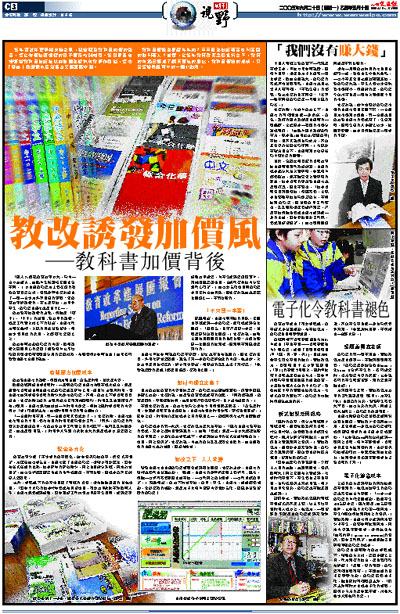 「踏入21世紀教育改革以來,行內一直叫苦連天;這幾年生態環境已經完全不同。」以出版教科書為主要業務的香港教育圖書公司,副總編輯李家駒道出了一個一直少為外界留意的事實:受教育改革所影響的,不止是學校、老師和學生,教科書出版社也是其中之一。