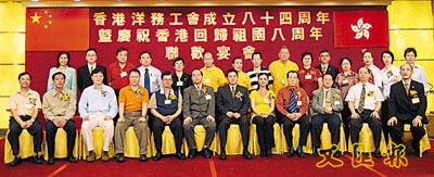 【本報訊】(記者 施立偉)香港洋務工會日前假座北角新都會酒樓舉行慶祝工會成立84周年暨慶祝香港回歸祖國8周年聯歡晚宴。應邀出席的嘉賓有:中央政府駐港聯絡辦社工部部長張鐵夫,行政會議成員、工聯會會長鄭耀棠,工聯會副理事長李永生、陳志光,立法議員王國興,以及各工會代表、會員、家屬,賓主歡聚一堂,場面熱鬧。