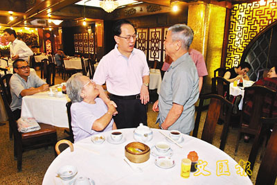 得如茶樓品茗期間,煲呔四出與茶客聊天。