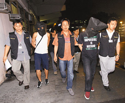 反黑組探員將兩名俗稱「老東」的黑社會成員押返住所調查。 鄺福強 攝