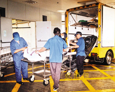消防車為救老翁撞車,惜老翁送院後終告不治,遺體由仵工移送殮房。