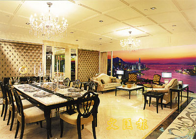 名門英國古典式宮廷設計示範單位,特大豪華客飯廳面積近600呎,為住客盡享維港景致,特設約22呎宏闊落地大玻璃及約70平方呎弧形環保大露台。
