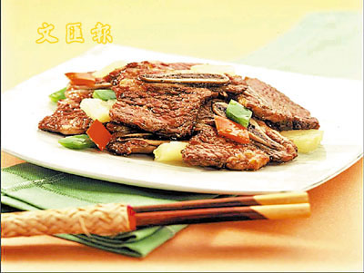 做法:1.牛仔骨切件,拌入醃料待1/2小時。2.菠蘿切件,青紅椒切欖角形。3.燒3湯匙油,放下牛仔骨以中火煎至九成熟,取出。4.剩1湯匙油,爆香配料,把牛仔骨回鑊與芡汁一起兜勻。5.最後淋入蜜糖兜炒即成。