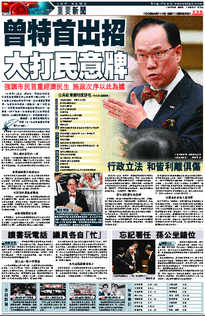 【本報訊】(記者 邱萍菲、葉傲冬)昨日是行政長官曾蔭權正式上任的第二個工作日,下午他到立法會出席答問大會。他向議員反覆強調,特區政府今後的一切施政,會「以民為本」,以民意為依歸確定施政的優先次序。他透露,4月下旬的一次有關各類公共政策的民調發現,25個政策議題之中,市民最關注的11個議題,主要都是經濟民生問題(註:特首與議員答問摘要刊A18版)。